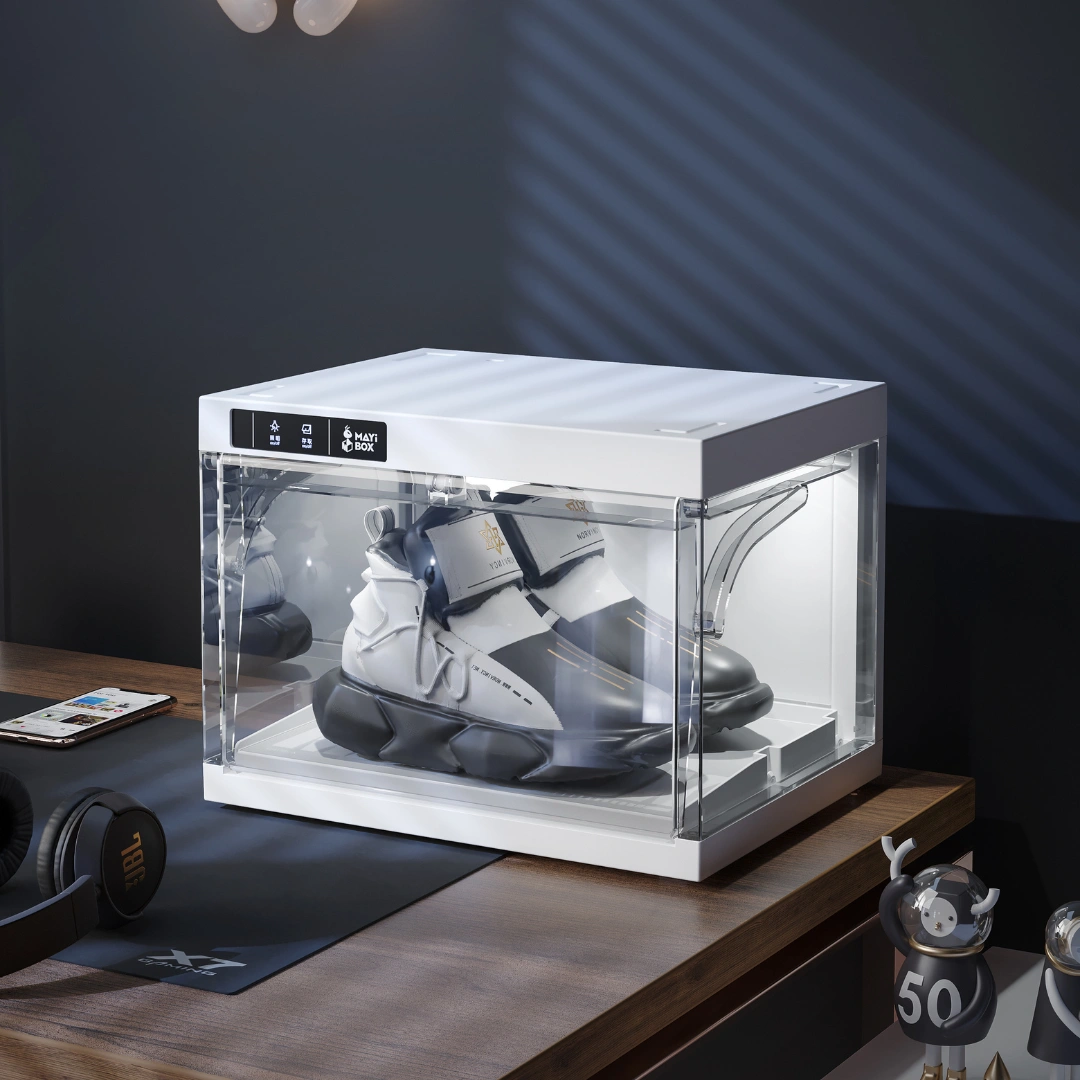 The SoleMate IllumiCube is not just any shoe display; it’s a testament to the ultimate combination of functionality and elegance. Each box is crafted with the unparalleled strength of Acrylonitrile Butadiene Styrene (ABS) and Polycarbonate (PC). ensuring durability and a sleek finish. Including LED lights takes this piece a notch higher. allowing your prized footwear to shine in all its glory.